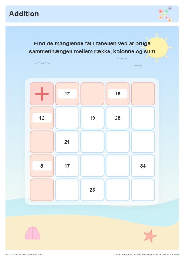 Find de manglende tal i taltabellen ved hjælp af addition