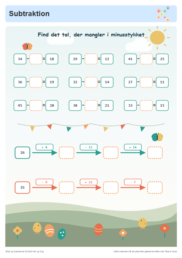 Find de manglende tal med subtraktion og addition