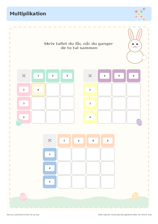 Multiplikation i påsketema hvor eleverne skal udfylde tabeller