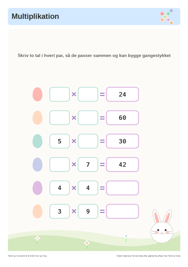 Multiplikation i påsketema hvor regnestykket bygges