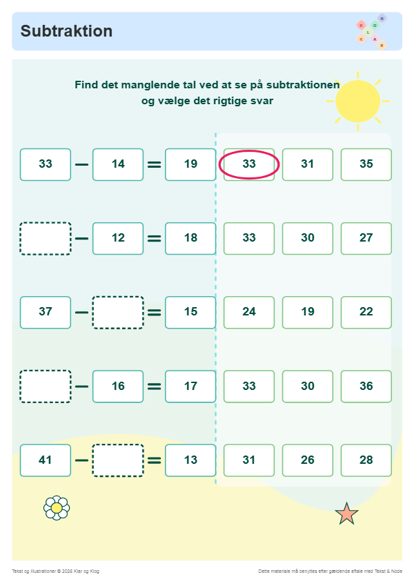 Find de manglende tal med subtraktion og sommer tema